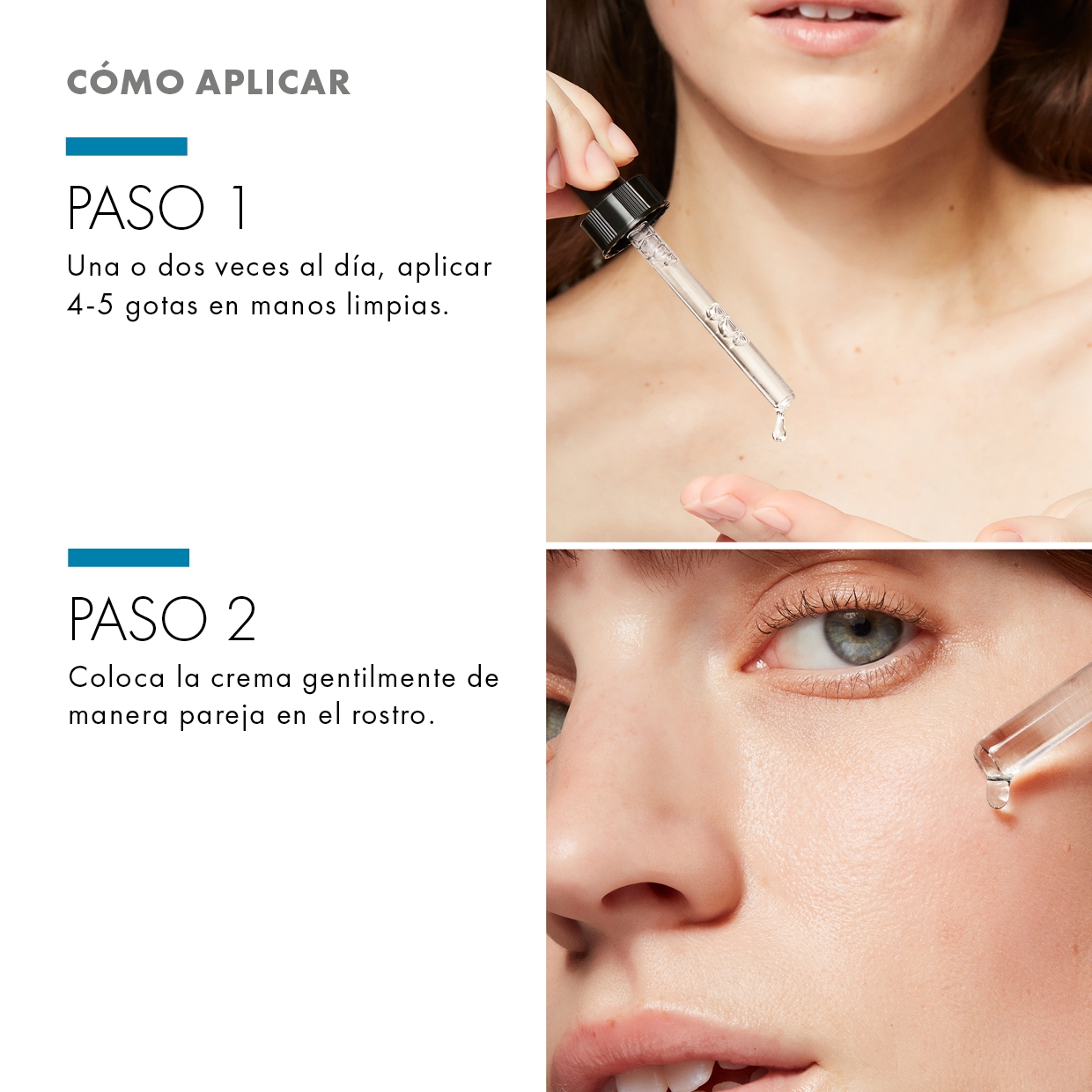 Se recomienda su uso diario mañana y/o noche, aplicando 4 o 5 gotas de producto sobre el rostro seco y extendiéndolas por toda la superficie facial, excepto contorno de ojos y mucosas.